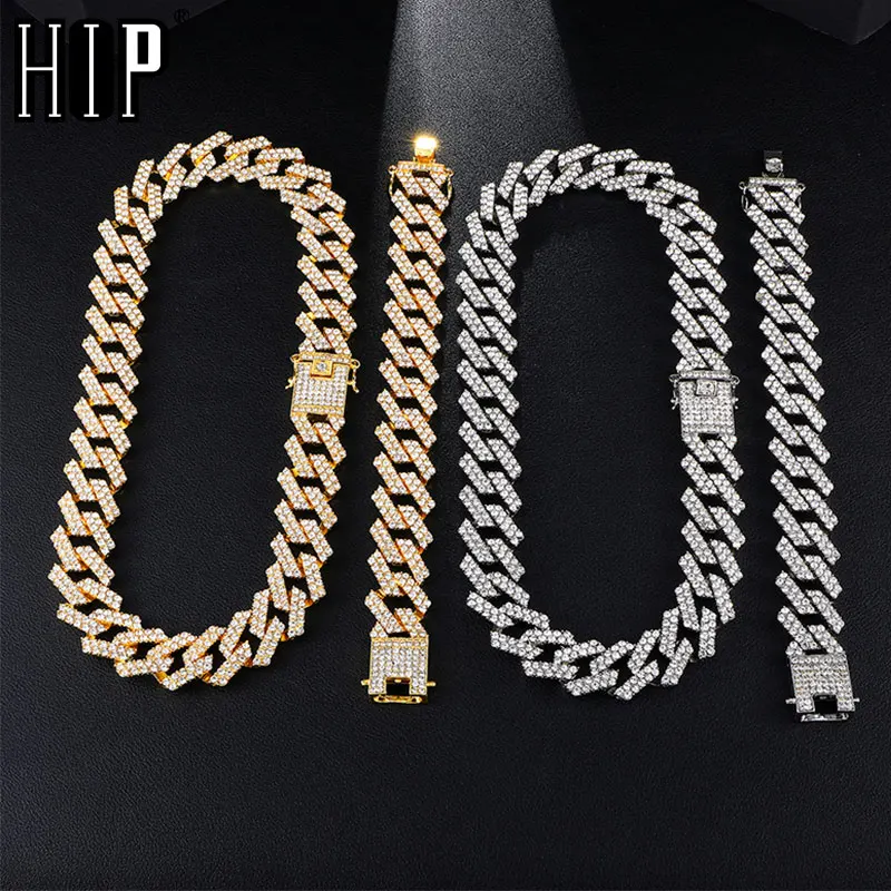 TOP Hip Hop 1Set 20MM Gold Silver Heavy Full Iced Out Paved Rhinestones Cuban Chain CZ Bling Rapper Nec