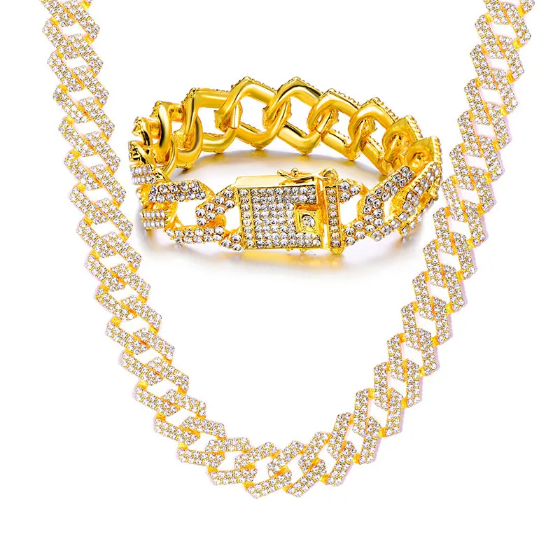 Best Seller Hip Hop 1Set 20MM Gold Silver Heavy Full Iced Out Paved Rhinestones Cuban Chain CZ Bling Rapper Nec